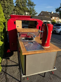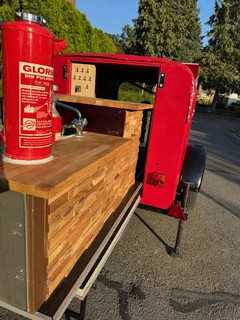Nach und nach kamen viele kleine Dinge, wie die Halterung für die Bierfässer (die wir ganze dreimal aus- und wieder einbauen mussten, da irgendetwas nicht passte, wir an irgendetwas nicht gedacht hatten, oder sie einfach im weg war), die C02-Flasche, Spülbecken, Arbeitsplatte und nicht zuletzt der Zapfhahn dazu. Einige Dinge, wie die Türen des Auszugs noch als Prototyp, damit für die ersten Test überhaupt etwas vorhanden war. Auch im verborgenen Tat sich einiges: Abwasserablauf, Stromverkabelung, Frischwasseranschluss, Beleuchtung (der Anhänger brauchte ja auch irgendwann TÜV) und Innenraumbeleuchtung, damit man nicht im Dunkel steht - um nur einige der Dinge zu nennen.