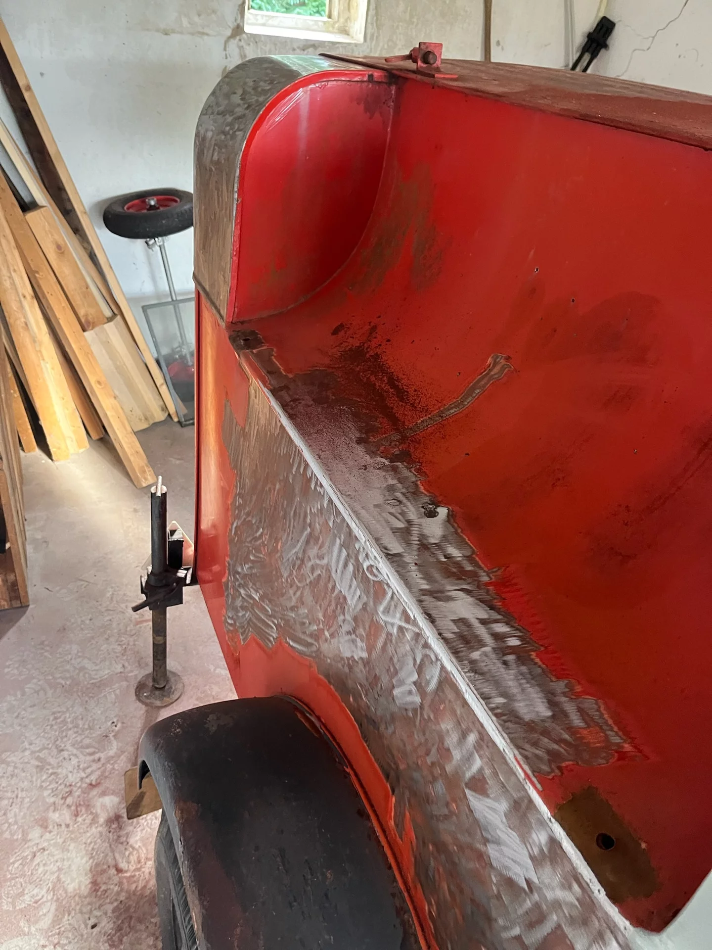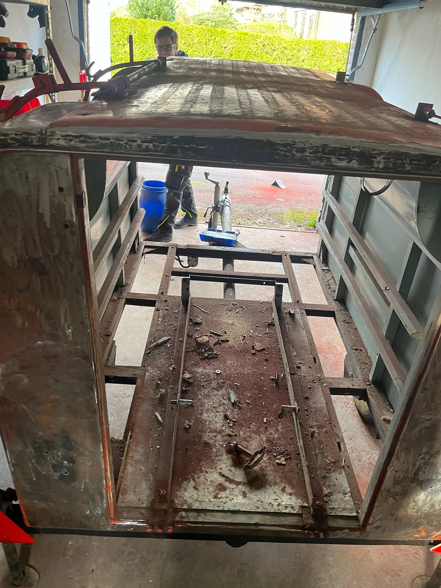 Danach hieß es dann Farbe entfernen. Da doch die ein oder andere Roststelle zu entdecken war, musste neue Farbe drauf und vorher die alte runter. Geplant war nur außen, bis ich (Simon) eines vormittags Leander anrief und sagte: "Das kann hier alles nicht so bleiben, die Außenhaut muss runter". Nun war der Anhänger also nackig, die Farbe aber immer noch auf dem Metall. An dieser Stelle wäre es Rückblickend vermutlich einfacher gewesen einfach eine gänzlich neue Außenhaut zu bauen und die alte zu entsorgen, aber wir dachten uns, den Lack schleifen wir einfach "mal eben" mit der Flex runter. Das hat leider gar nicht so gut und schon gar nicht "mal eben" geklappt. So kam es, dass die Teile, nachdem kein Sandstrahler sie haben wollte und Leanders eigene Versuche kläglich scheiterten, zum Abbeizen gingen. Die zeitlichen Dimensionen lassen sich hier nur schwer darstellen, aber bereits durch die Entscheidung den Anhänger in alle Einzelteile zu zerlegen und der Tatsache das der DDR-Lack sein Herkunftsland bei weitem überlebt hat, lagen wir nun schon deutlich hinter unserem Zeitplan.